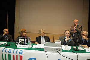 Nella foto, Nino Benvenuti al tavolo di presidenza con i dirigenti del Coni, durante l’intervento di Gianni Virgadaula, presidente provinciale di Federboxe